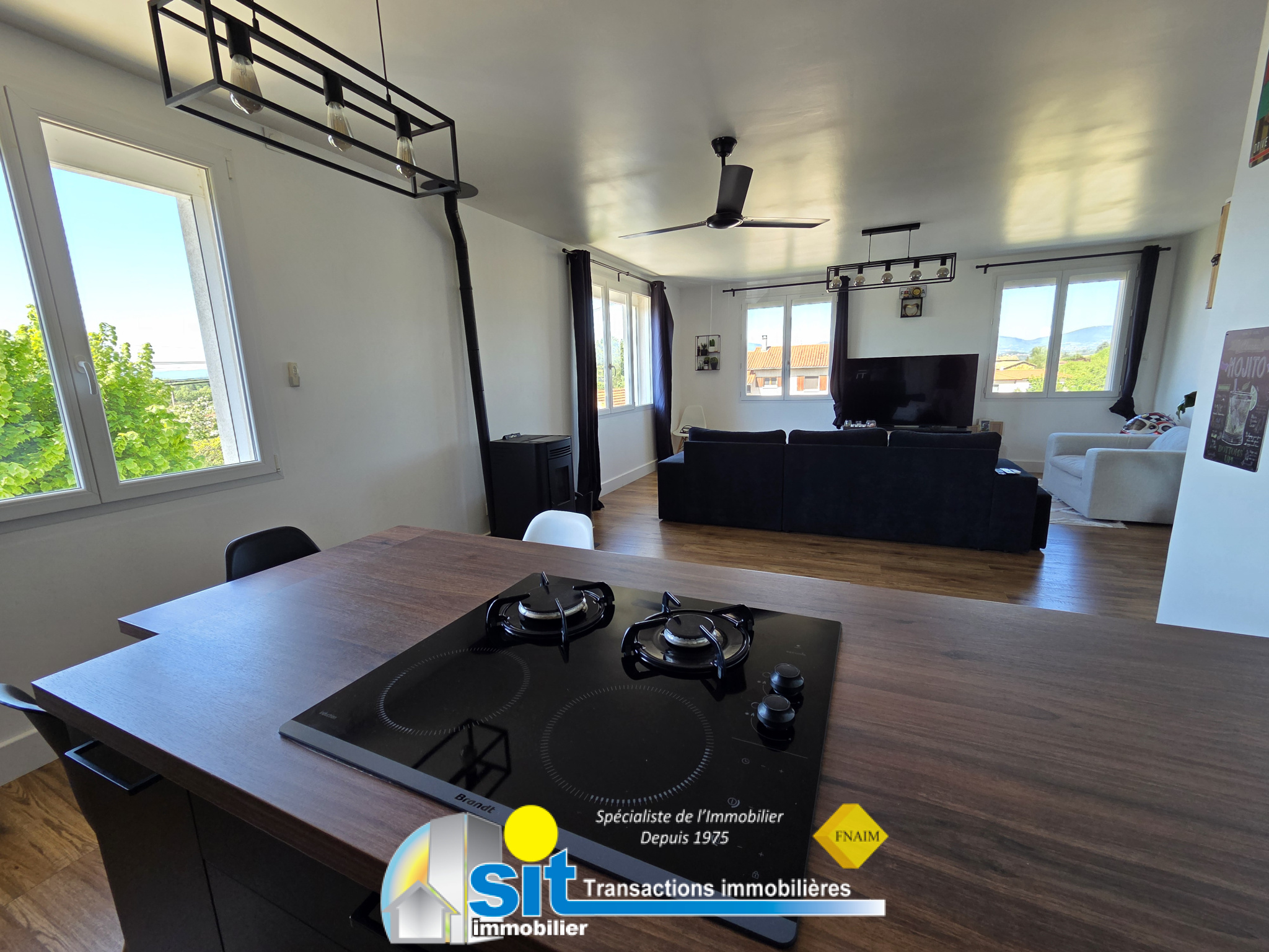 À l’étage, la maison offre une belle pièce de vie lumineuse d’environ 46 m², avec cuisine ouverte, idéale pour les moments de convivialité en famille, agrémentée d’un poêle à granulés.