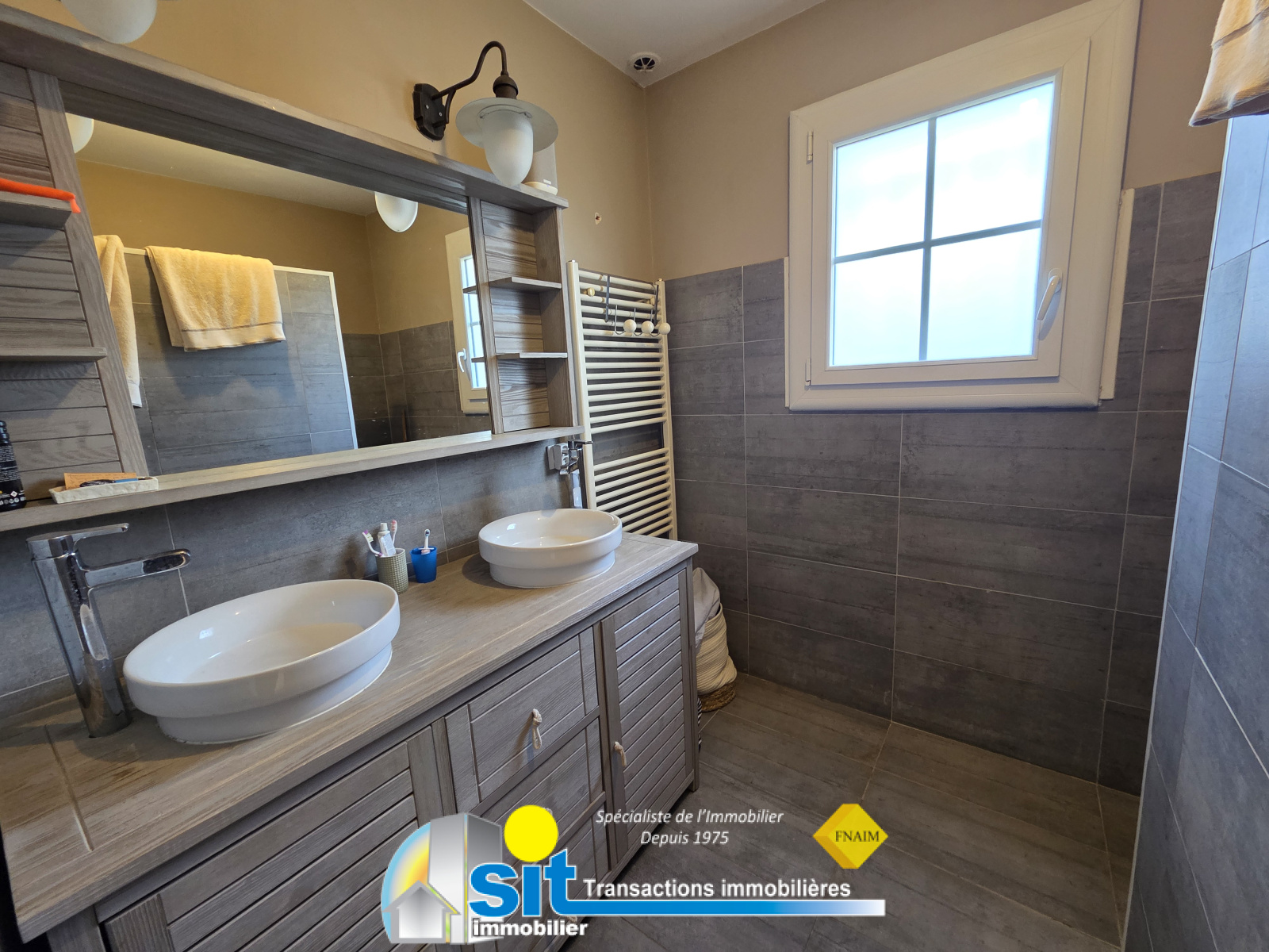 Au rez-de-chaussée : une entrée desservant un vaste salon-séjour lumineux, une cuisine entièrement équipée et rénovée en 2022, une suite parentale avec dressing et vue sur la piscine, une seconde chambre avec accès direct à la terrasse, ainsi qu’une salle d’eau.